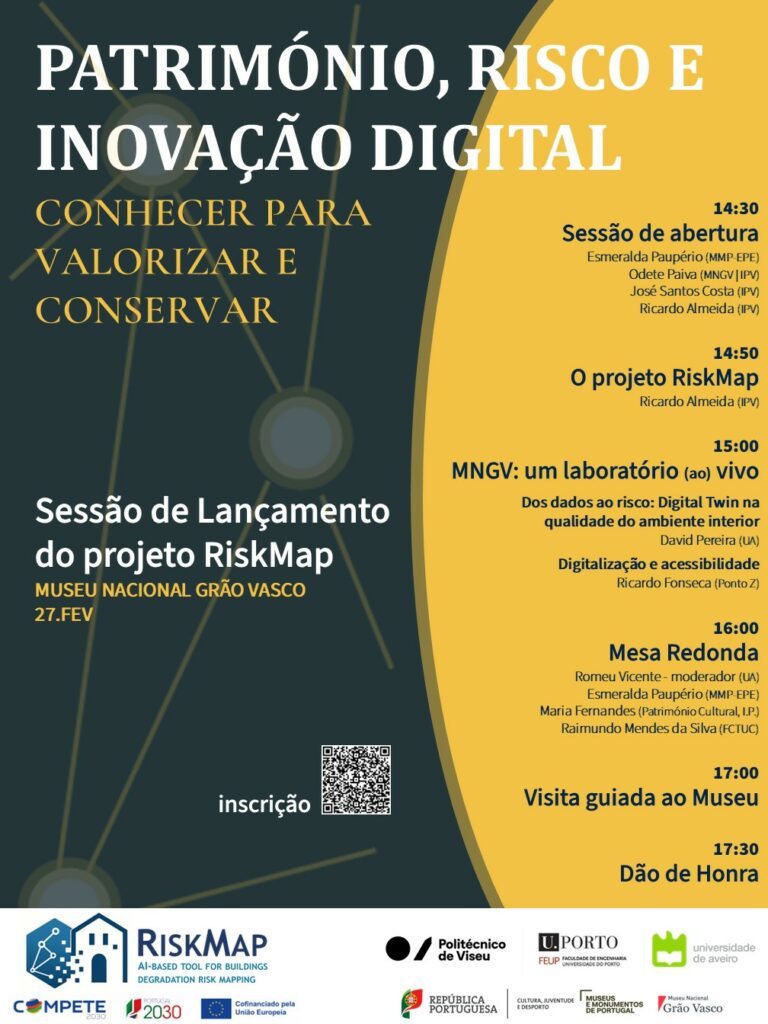O Museu Nacional Grão Vasco acolhe, no próximo 27 de fevereiro, a Sessão de Lançamento do projeto RISKMAP (http://www.estgv.ipv.pt/riskmap), um projeto de investigação liderado pelo Instituto Politécnico de Viseu (IPV), com coordenação científica no Departamento de Engenharia Civil, e dedicado à aplicação de tecnologias digitais na conservação e valorização do património edificado.