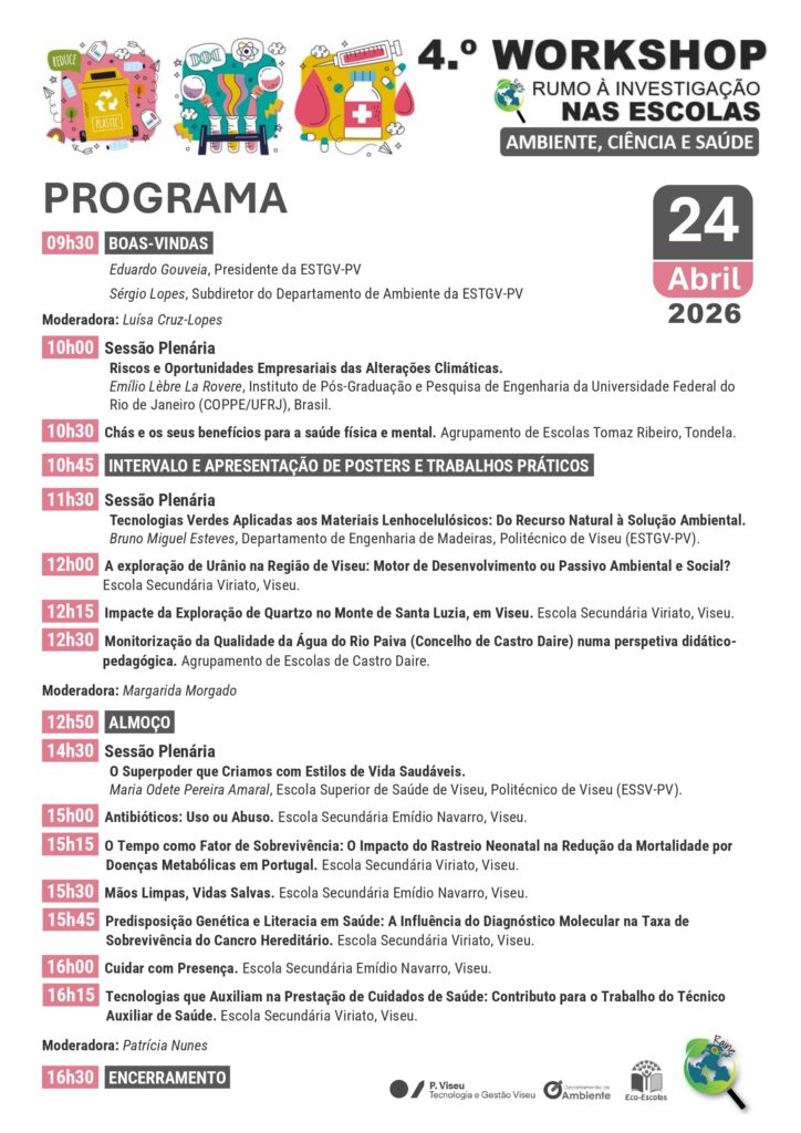 No dia 24 de abril de 2026, o Departamento de Ambiente da ESTGV-IPV promove o 4.º Workshop Rumo à Investigação nas Escolas (RAINE), dedicado ao tema “Ambiente, Ciência e Saúde”. O evento reúne especialistas e estudantes, contando com 3 conferências plenárias, 15 posters e 10 comunicações orais, onde serão apresentados projetos inovadores do ensino secundário. Com mais de 200 participantes inscritos, afirma-se como um espaço de partilha científica, pensamento crítico e aproximação entre ensino secundário e superior, incentivando o interesse pela investigação. Uma das organizadoras, Luísa Cruz-Lopes, destaca: “Será uma oportunidade única para inspirar o futuro dos estudantes”.
