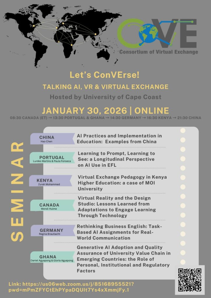 Promovido pelo Consortium of Virtual Exchange (CoVE), o seminário constitui um espaço internacional de reflexão e partilha sobre práticas pedagógicas inovadoras no ensino superior, com especial enfoque na Integração da Inteligência Artificial e da Realidade Virtual nos processos de ensino-aprendizagem. Neste enquadramento, será igualmente explorado o papel da mobilidade virtual enquanto abordagem pedagógica estruturante e complementar às formas tradicionais de mobilidade académica.