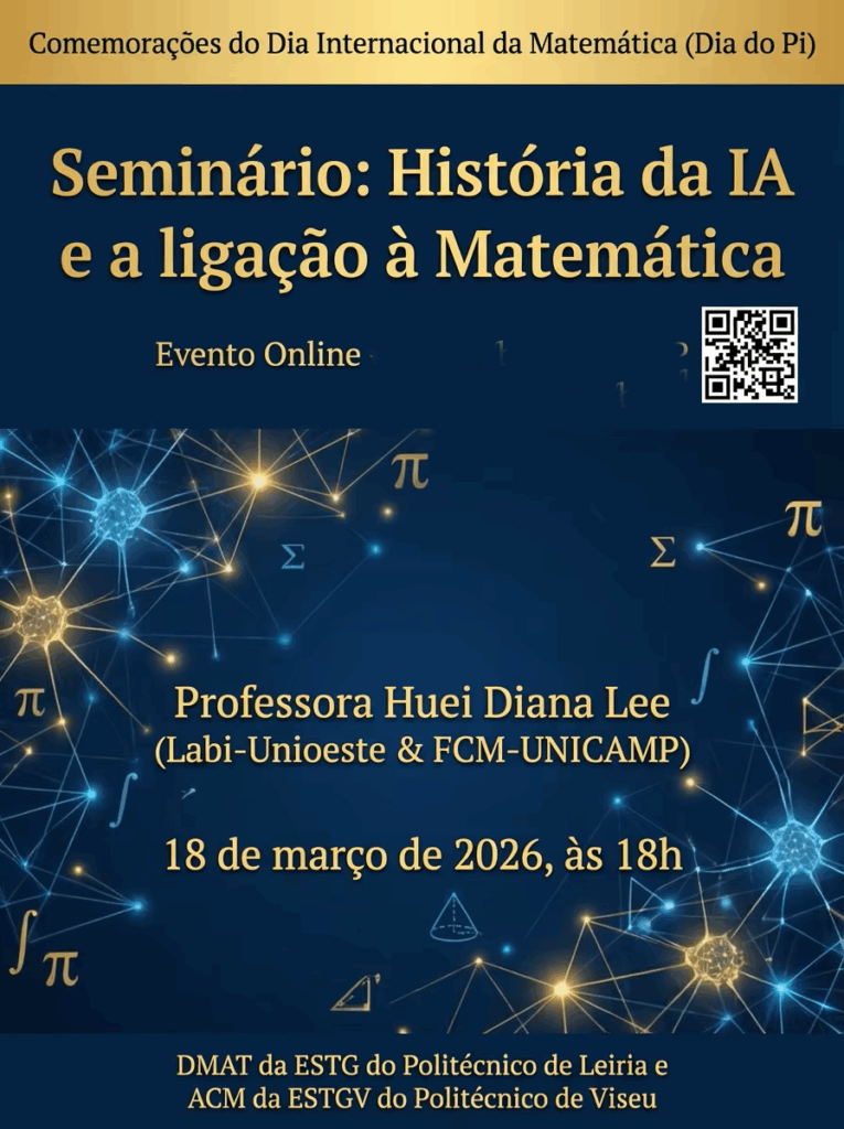 O Dia da Matemática é celebrado internacionalmente a 14 de março – Dia do Pi (3/14). Para assinalar esta data, o Instituto Politécnico de Viseu e o Instituto Politécnico de Leiria convidam a Professora Huei Diana Lee, da Universidade Estadual do Oeste do Paraná e Coordenadora do Laboratório de Bioinformática (LABI), para nos conduzir numa breve exploração sobre a História da Inteligência Artificial e a ligação à Matemática.